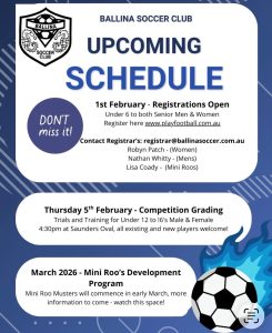 As we prepare for the 2026 season, Ballina Soccer Club has an exciting schedule ahead with training, trials and key club dates coming up.